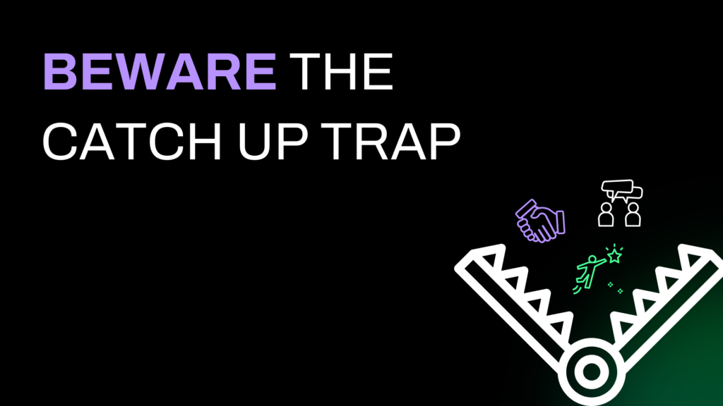 The catch up trap is a phenomenon where meetings such as 1-2-1s, departmental monthly get togethers or quarterly all-hands devolve into a routine checklist of binary questions and answers on a set date with a specific group of people…”How many new proposals have you sent out this month?”, “Five”, “What’s your current quota attainment at for the quarter?”, “78%”, “Can our office become pet-friendly?”, “No”.